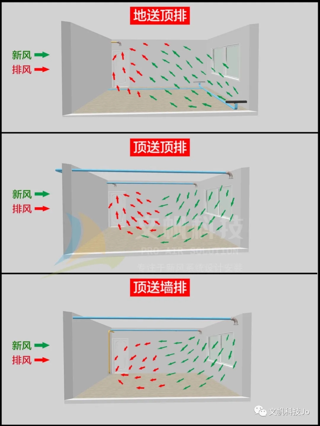 污濁的空氣密度大所以在房間下方,從地面攪動向上頂,排出會更有效,但如果屋內長期揚塵過多,可能會潔凈度受影響。對角線上下對應排列會效果更理想,地送頂排或者頂送墻排。